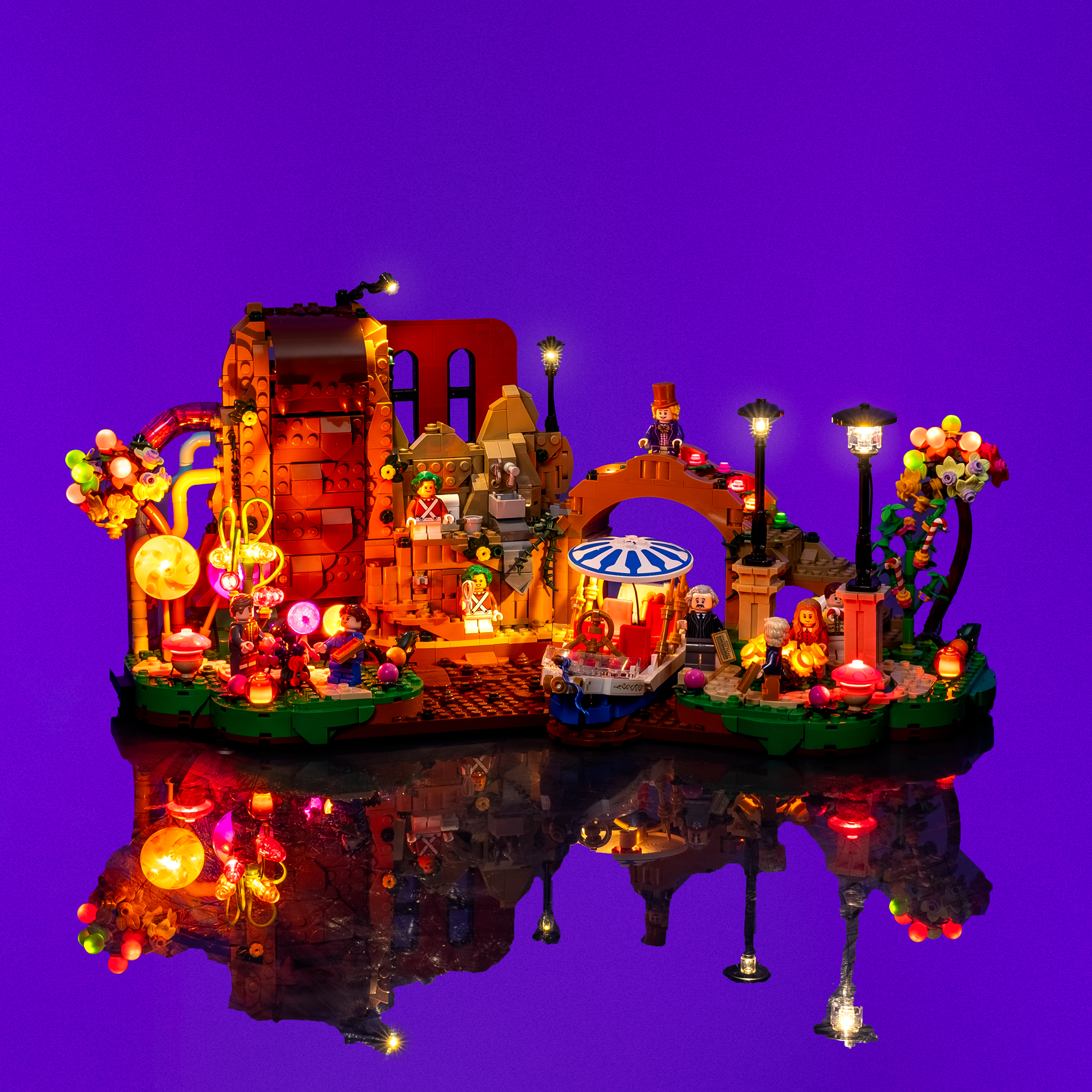Step into a world of pure imagination with a vibrant Light My Bricks™ Light Kit for the LEGO® Ideas Willy Wonka & The Chocolate Factory 21360. Bursting with colour, the lollipops, candy trees, and sweets are lit in dazzling hues, transforming the chocolate garden into a magical spectacle.